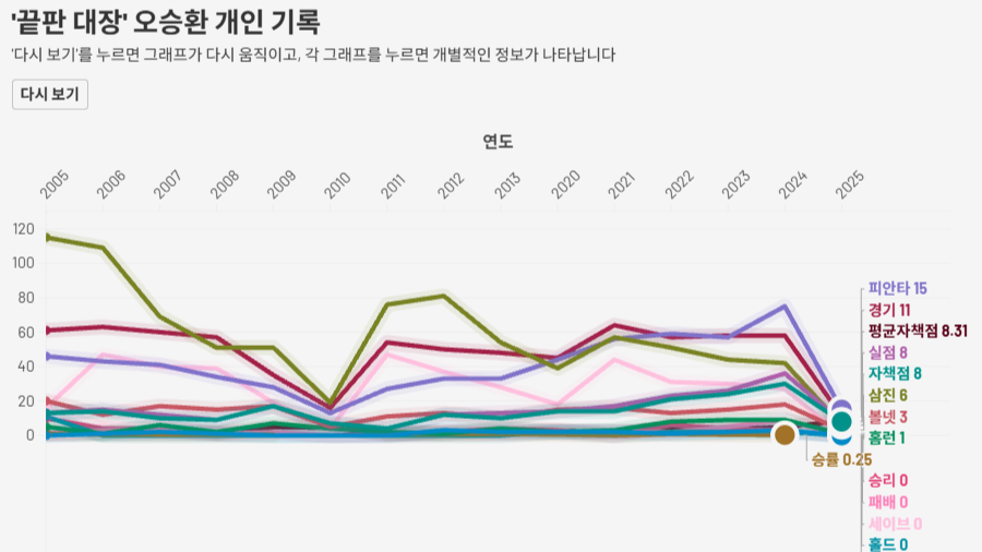 A Flourish chart본격적인 '오승환 은퇴 투어'에 돌입한 삼성라이온즈가 첫 경기에서 연장 접전 끝 패배로 아쉬움을 삼켰습니다.8월 28일 저녁 서울 잠실구장에서 펼쳐진 2025 신한 SOL 뱅크 KBO리그 두산베어스와의 주중 3연전 마지막 대결에서 삼성은 일찌감치 무너진 선발 최원태와 극적 추격으로 만든 동점에서 마운드...