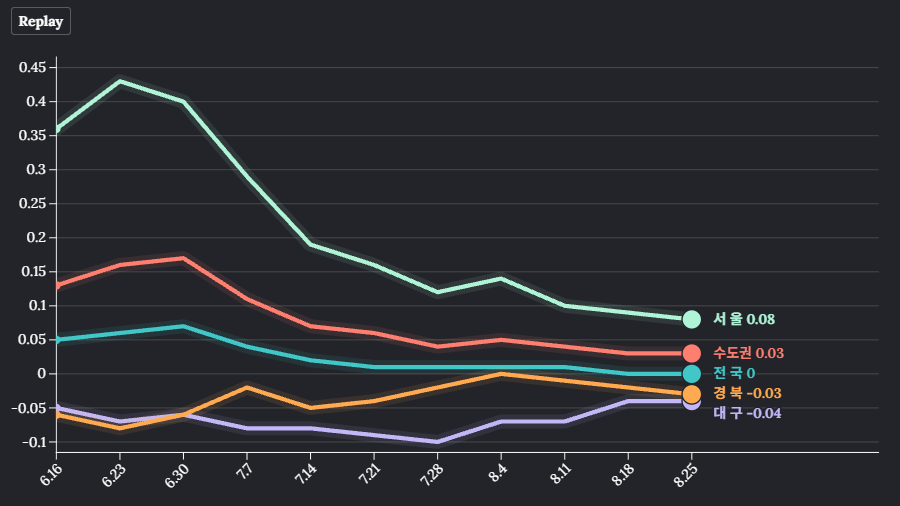 A Flourish chart대구의 아파트 매매가격이 92주째 내렸습니다.한국부동산원에 따르면 8월 넷째 주 대구의 아파트 매매 가격이 지난주보다 0.04% 더 떨어져 2023년 11월 셋째 주부터 시작된 하락세가 92주 연속 이어졌습니다. 2025년 8월 넷째 주 전국 주간 아파트 가격 동향은 전국적으로 매매가격은 0.00%로 보합, 전셋값...