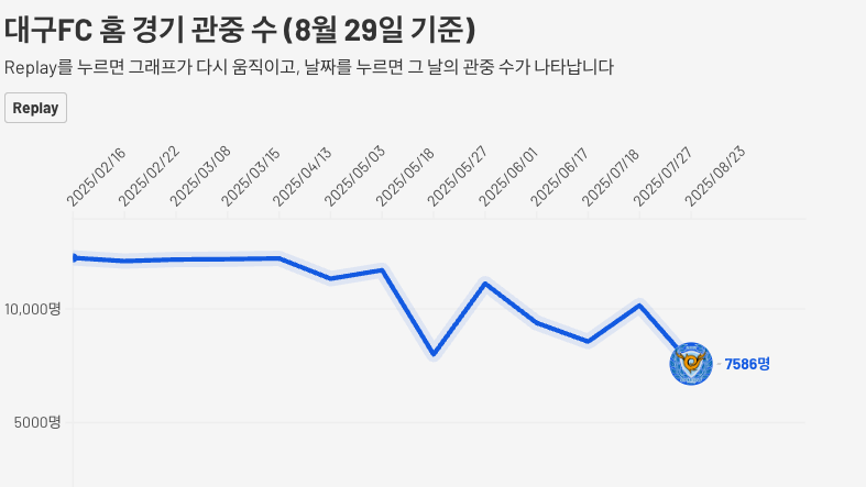 A Flourish chart든든한 수호자로 대구FC와 함께 해온 '엔젤클럽'이 브랜드데이로 팀의 무승 탈출과 반등 발판을 마련하겠다는 각오입니다.8월 30일 오후 7시 대구iM뱅크파크에서 펼쳐지는 하나은행 K리그1 2025 수원FC와의 28라운드에 엔젤클럽 10주년 브랜드데이가 개최됩니다. 지난 2015년 당시 2부 리그에 있던 대구FC...