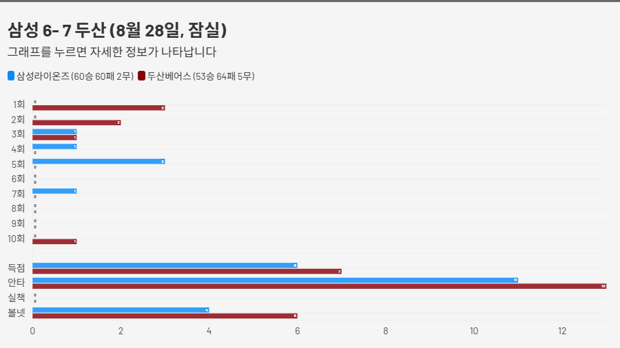 Interactive content by Flourish연승이 끊어진 삼성라이온즈가 대전 원정에서 5연속 위닝시리즈 도전에 나섭니다.8월 28일 저녁 서울 잠실구장에서 펼쳐진 두산베어스와의 2025 신한 SOL 뱅크 KBO리그 3연전 마지막 경기에서 삼성은 6점 차 리드를 내주고도, 동점을 만들며 승부를 연장으로 끌고 갔지만, 승리를 가져오진 ...