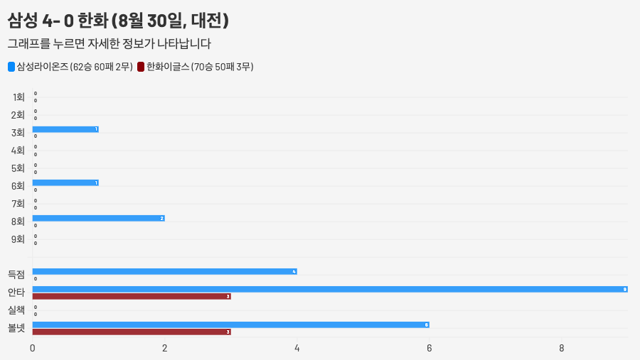 Interactive content by Flourish시즌 20번째 퀄리티스타트와 3경기 연속 승리에 도전하는 아리엘 후라도를 선발로 삼성라이온즈가 순위 상승을 노립니다.8월 30일 대전한화생명볼파크에서 펼쳐지는 2025 신한 SOL 뱅크 KBO리그 한화이글스와의 맞대결에서 삼성은 다시 연승 모드를 가동하겠다는 각오입니다.팀 연승을 책임...