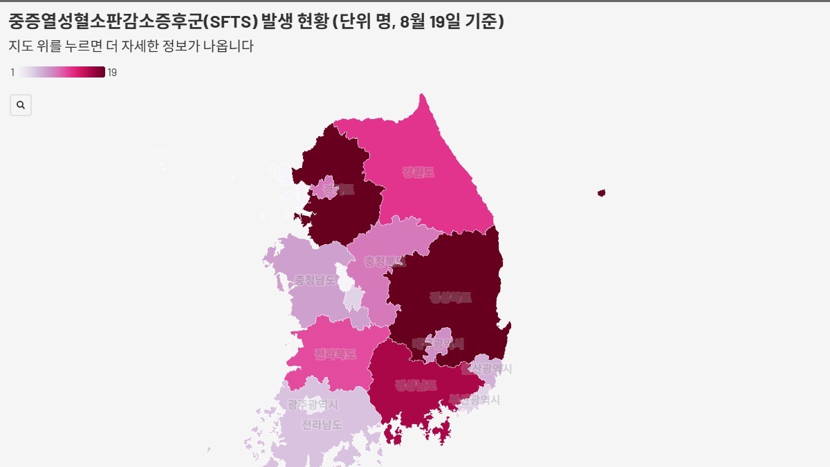 A Flourish map대구에서 2025년 처음으로 60대 여성이 참 진드기 매개 감염병인 중증열성혈소판감소증후군으로 숨진 것으로 나타났습니다.대구시에 따르면 최근 오한 증세 등으로 대학병원에서 진료를 받았던 60대 여성이 중증열성혈소판감소증후군, SFTS 양성 판정을 받고 치료를 받다가 8월 초 숨졌습니다.대학병원 측은 ...