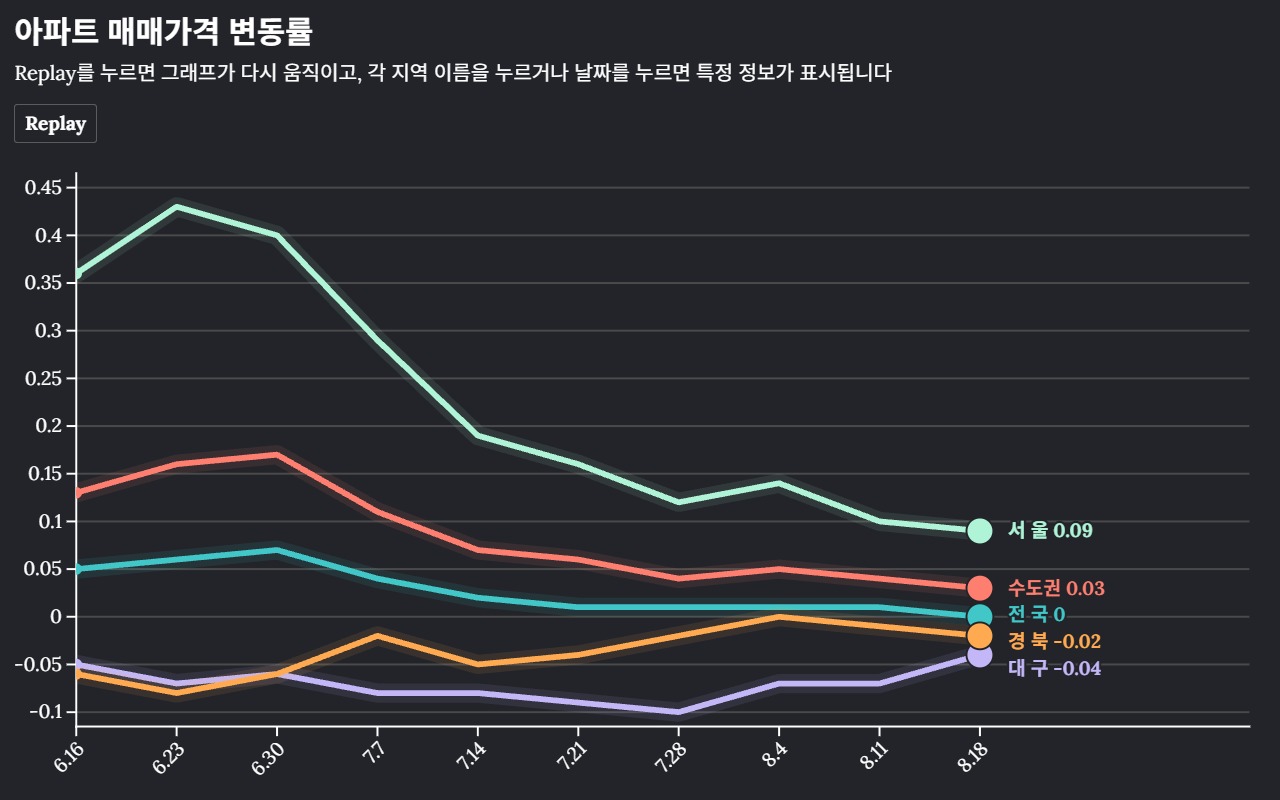 A Flourish chart전국의 아파트 가격이 안정세를 보이고 있지만, 대구와 경북의 아파트 가격은 계속 하락하고 있습니다.한국부동산원이 발표한 전국 주택 가격 동향 조사에 따르면, 8월 셋째 주 전국의 아파트 가격 변동은 0%, 전셋값은 0.01% 상승한 것으로 나타났습니다. 서울의 아파트 매매 가격은 0.09% 오른 데 비해 ...