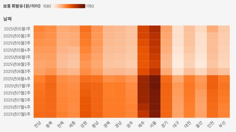 A Flourish heatmap한국석유공사 유가 정보서비스 오피넷에 따르면 2025년 7월 다섯째 주 대구의 주유소 휘발유(보통 휘발유) 평균 판매가격은 한 주 전보다 0.3원 내린 리터당 1,637.9원으로 4주 연속 하락했습니다.자동차용 경윳값은 한 주 전보다 2.2원 오른 리터당 1,499.8원으로 2주째 오름세가 이어졌습니다. 같은 기...