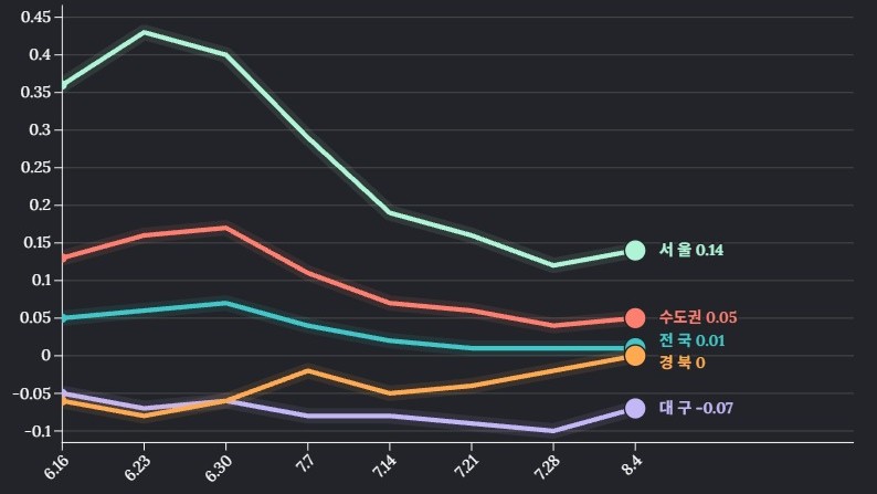 A Flourish chart대구 아파트 매매가격이 89주째 하락했습니다.한국부동산원의 2025년 8월 첫째 주(8월 4일 기준) 주간 아파트 가격 동향에 따르면 대구의 아파트 매매가격은 한 주 전보다 0.07% 떨어졌습니다. 북구(-0.13%)는 구암·읍내동 구축 중소형 규모 위주로, 달서구(-0.09%)는 용산·감삼동 위주로, 서구(-0.09%)는 ...