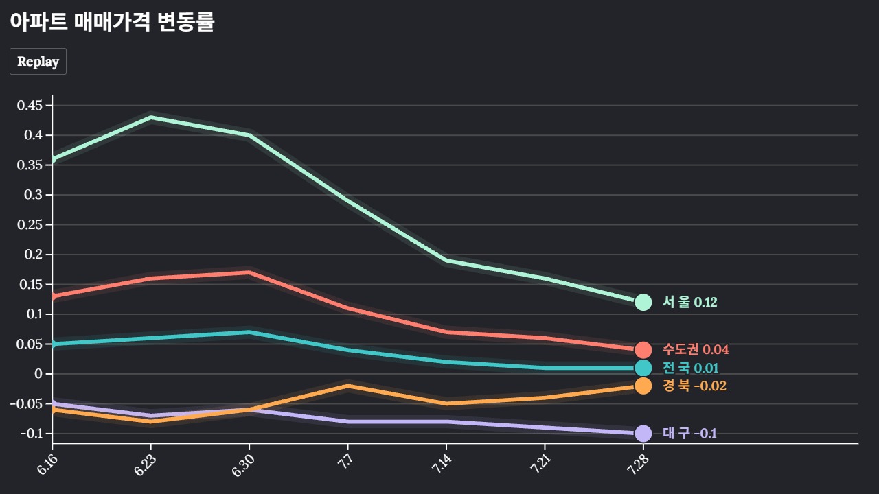 A Flourish chart대구 아파트 매매가격이 88주째 하락했습니다.한국부동산원의 2025년 7월 넷째 주(7월 28일 기준) 주간 아파트 가격 동향에 따르면 대구의 아파트 매매가격은 한 주 전보다 0.10% 떨어졌습니다. 북구(-0.19%)는 검단·읍내동 구축 위주로, 달서구(-0.17%)는 용산·도원동 위주로, 서구(-0.08%)는 비산·평리동...