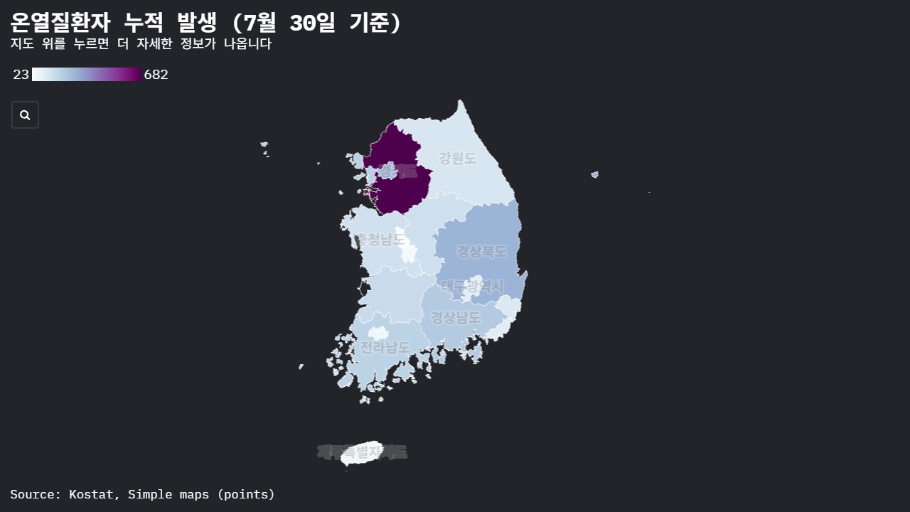 A Flourish map7월 30일 오후 3시 20분쯤 경북 경산시 진량읍의 한 논에서 80대 남성이 심정지 상태로 발견돼 병원으로 옮겨졌지만 숨졌습니다.경찰에 따르면 발견 당시 남성의 체온은 42.1도였고, 이날 오전 9시쯤 농사일을 하러 집을 나섰다 연락이 끊긴 것으로 파악됐습니다.경찰과 소방 당국은 남성이 열사병으로 쓰러...