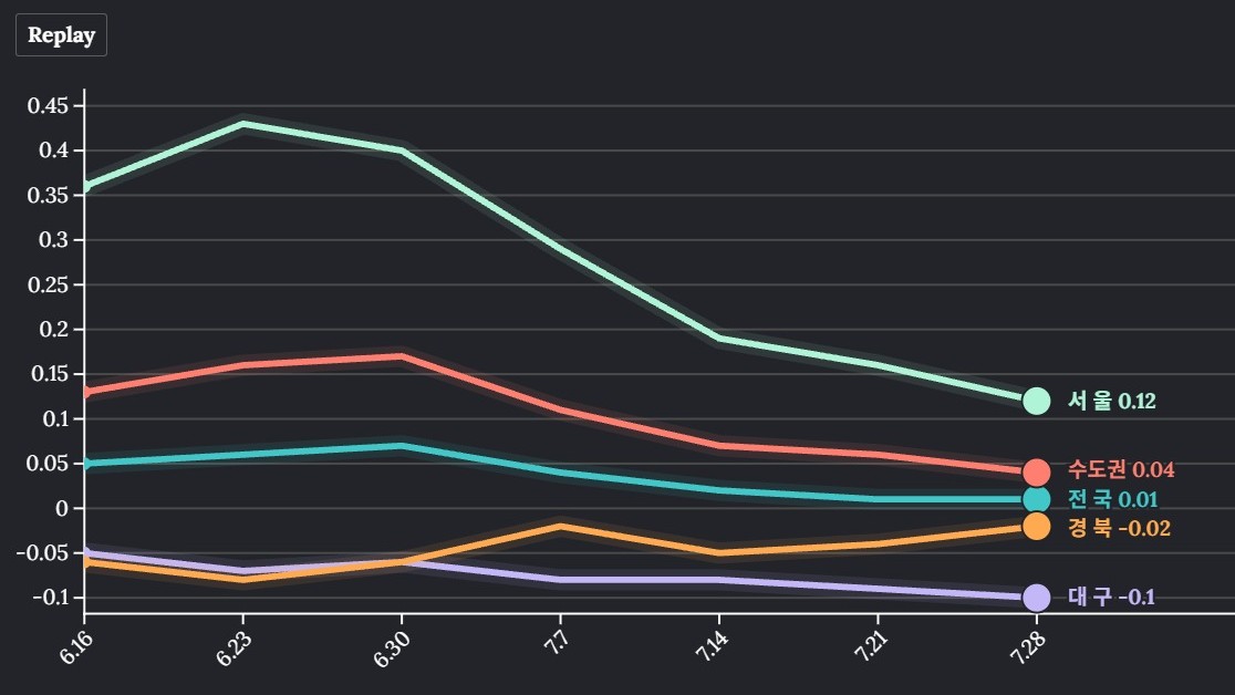 A Flourish chart 대구 아파트 매매가격이 87주 연속 하락했습니다.한국부동산원의 2025년 7월 셋째 주(7월 21일 기준) 주간 아파트 가격 동향에 따르면 대구의 아파트 매매가격은 한 주 전보다 0.09% 떨어졌습니다. 달서구(-0.21%)는 용산·도원동 구축 대단지 위주로, 북구(-0.10%)는 침산·구암동 중소형 규모 위주로, 남...