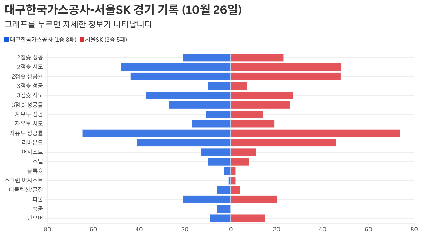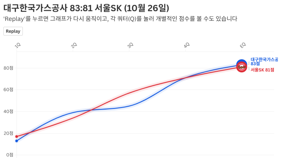 A Flourish chart리그에서 가장 늦은 첫 승을 거둔 대구한국가스공사가 2라운드 반격을 예고했습니다.10월 26일 홈인 대구체육관에서 펼쳐진 2025-26 LG전자 프로농구 서울SK와의 1라운드 마지막 경기에서 한국가스공사는 연장까지 가는 접전 끝에 83-81로 승리하며 연패 탈출에 성공합니다.앞서 펼쳐진 8경기를 내주며 최...