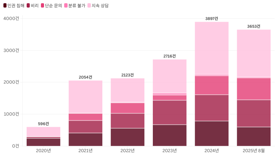 A Flourish chart체육계 인권 침해와 비리를 막기 위해 설립된 스포츠윤리센터가 전문 상담 인력 부족으로 심각한 운영난을 겪는 것으로 나타났습니다.조계원 더불어민주당 국회의원이 스포츠윤리센터로부터 받은 자료에 따르면, 센터가 설립된 2020년 9월부터 2025년 8월까지 5년 동안 접수된 상담은 1만 5,039건에 이릅니...