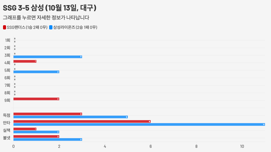 A Flourish chart시리즈 흐름을 결정지을 수 있는 3차전을 잡은 삼성라이온즈가 플레이오프에 한 발 더 다가섰습니다.10월 13일 저녁 대구삼성라이온즈파크에서 펼쳐진 2025 신한 SOL 뱅크 KBO 준플레이오프 SSG랜더스와의 3차전에서 삼성은 선발 원태인의 호투와 김성윤, 구자욱의 멀티 히트에 힘입어 5-3 승리를 거둡니다...