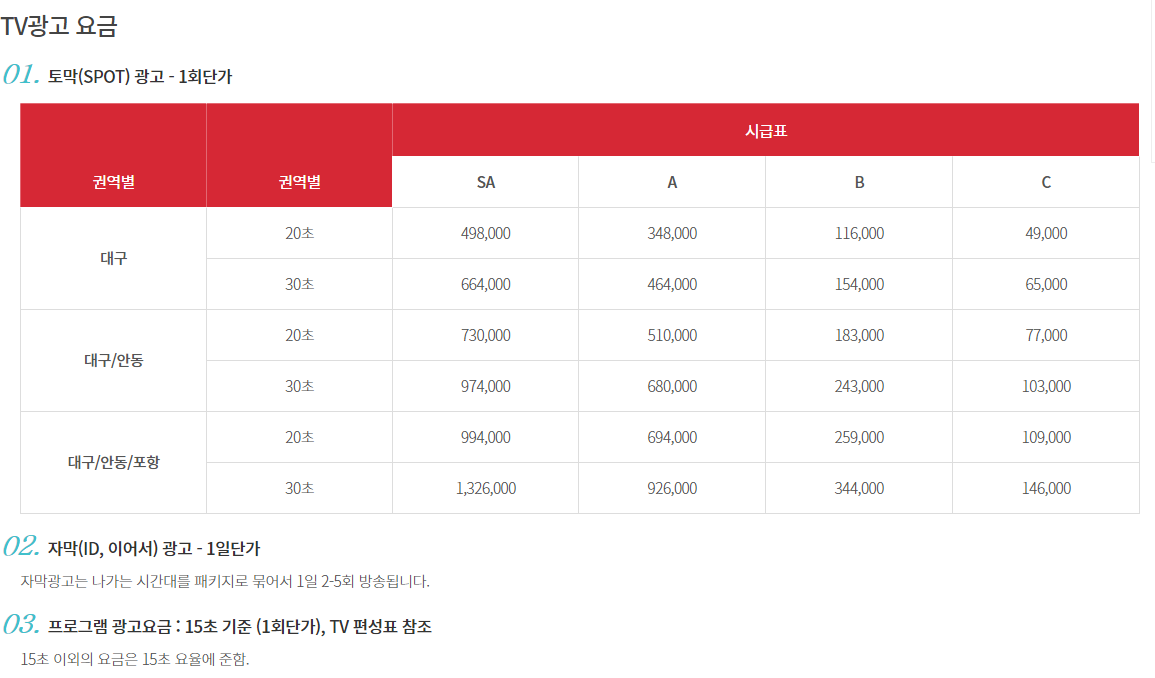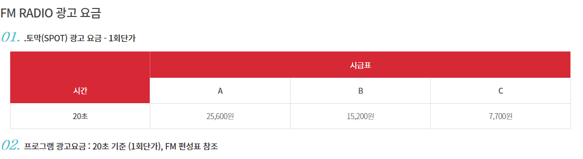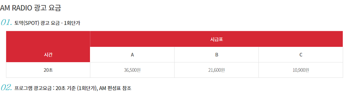 TV, 라디오 광고요금 TV편성표 다운로드 - 마우스클릭해서 다른이름저장으로 저장해주세요.AM편성표 다운로드 - 마우스클릭해서 다른이름저장으로 저장해주세요.20초 이외의 요금은 20초 요율에 준함. FM편성표 다운로드 - 마우스클릭해서 다른이름으로 저장해주세요.